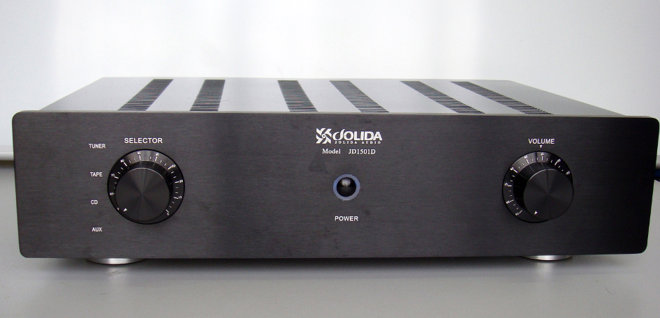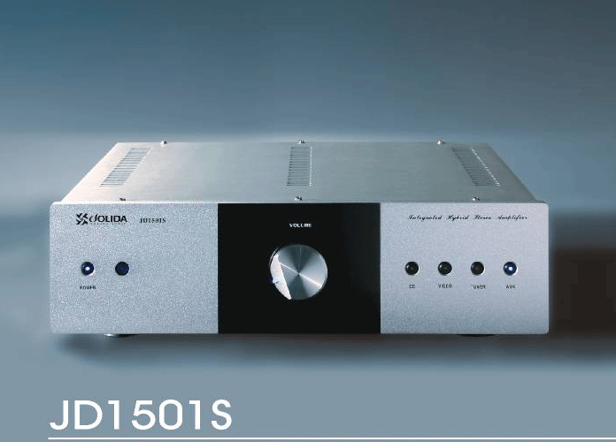 JD1502 (Nouvelle génération du 1501S) Amplificateurs Hybride 2x100W avec Tubes12AX7 en étage d'entrée Double push-pull de transistors Toshiba 2SK1943/2SJ5200 Télécommande Façade alu de 7mm. Nouvelle version avec les tubes des pré-amplification en façade 16kg