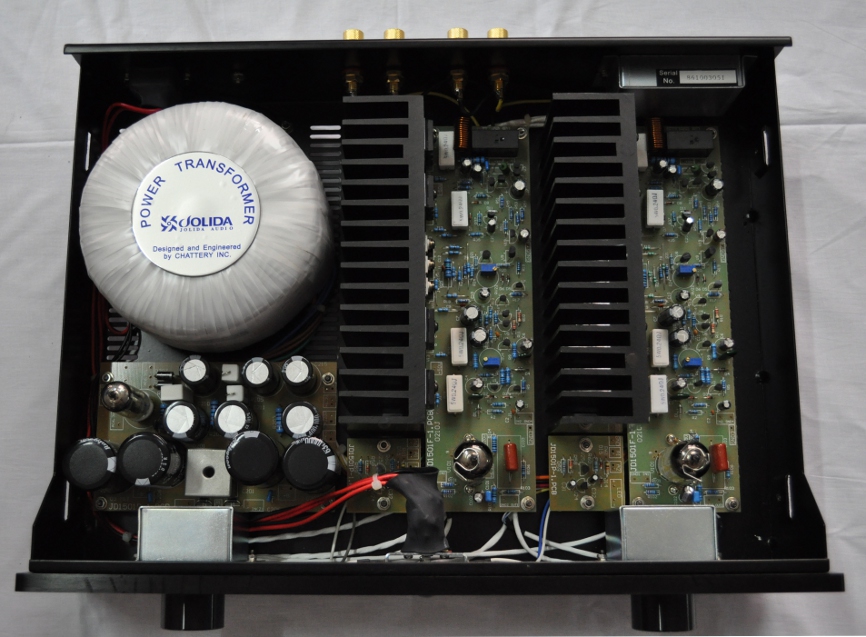 JD1501D (Nouvelle génération du 1501) Amplificateurs Hybride 2x100W avec Tubes12AX7 en étage d'entrée et ajout d'un tube régulateur pour la haute tension: le 6Z4. Cet ampli peut monter à 2x150W sous 4 ohms et sans distorsion grâce à un très gros transformateur d'alimentation de 700VA (voir photo) Double push-pull de transistors Toshiba 2SK1943/2SJ5200