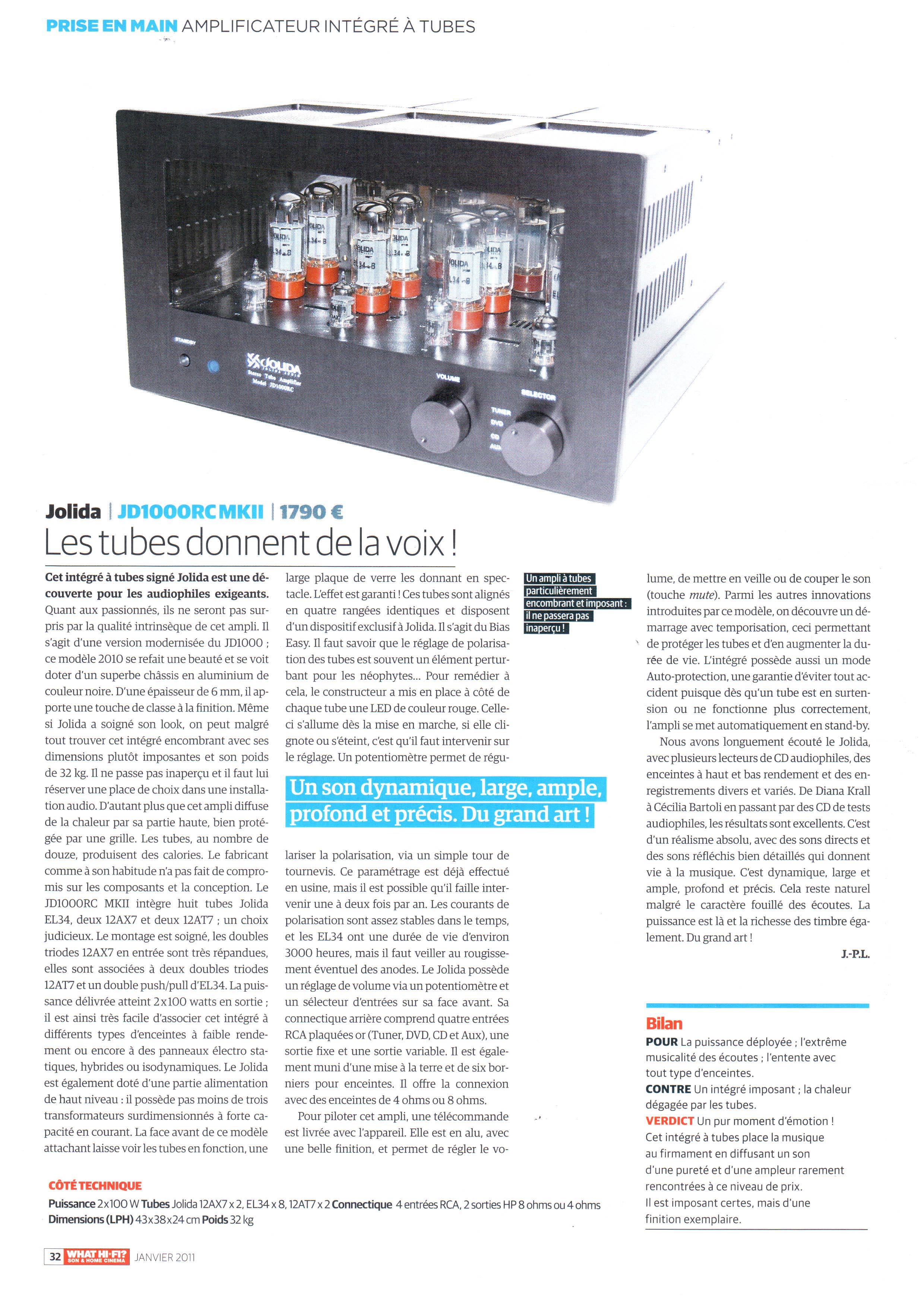 BANCS D'ESSAI JOLIDA Les amplis et lecteurs CD Jolida ont été testé par les plus grandes revues américains tel que Stereophile et le site spécialisé 6moons.com. En France ils ont été testé dans le Revue du Son, Haute Fidélité, et Stereo Prestige. |